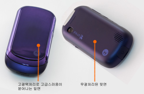 출고가 48만8400원의 이 짙은 보라색의 조약돌은 주머니에서 혹은 가방에서 꺼내면서부터 사람들의 시선을 사로잡기에 충분해 보인다. 곡선 마무리를 통한 고급스러움에 모토로라 특유의 심플함을 살려 디자인만으로도 크게 어필 하고 있다. 이에 더해 ‘히든 디스플레이’라는 ‘히든카드’까지 겸비하면서 유저들의 호응이 더 한층 더할듯 하다.