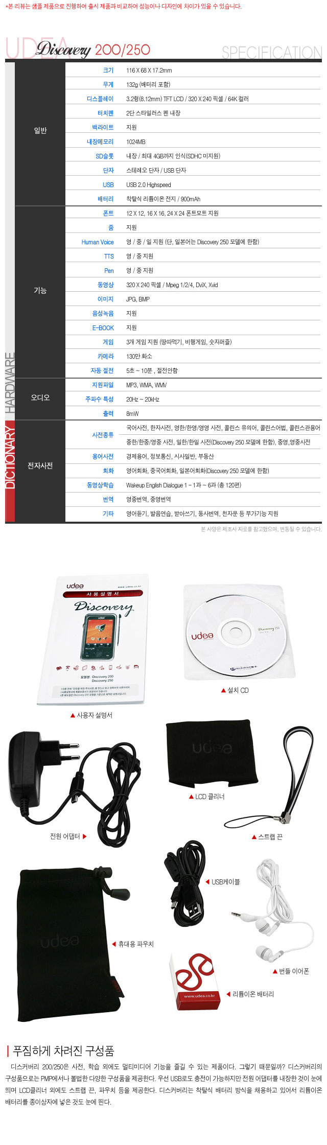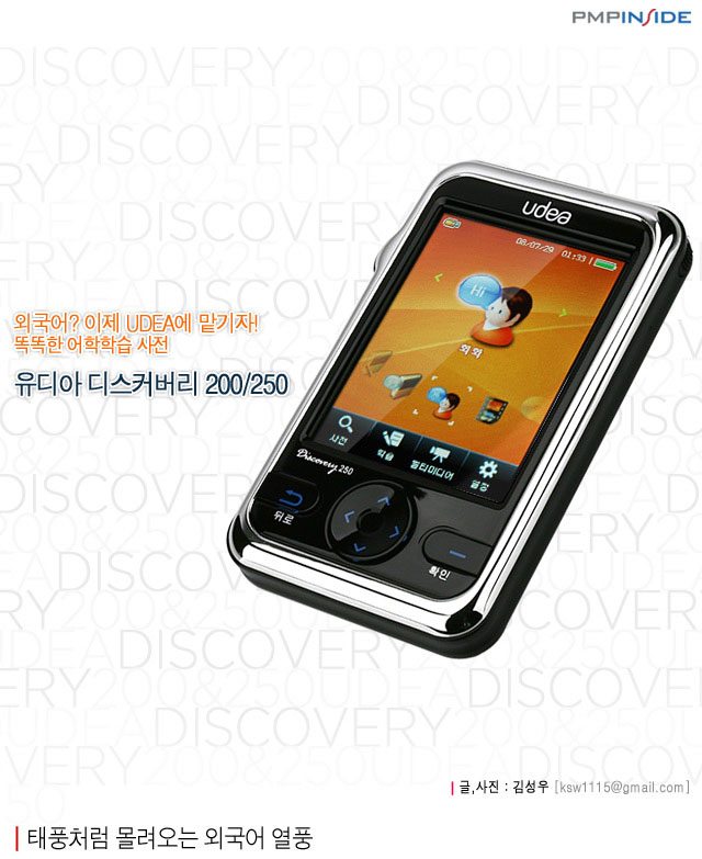 지구상에는 60억 이상의 인구가 살고 있고, 그 나라의 수도200여개에 이른다. 나라의 수가 많은 만큼 서로 표현하는 언어도 각기 다르다. 글로벌 시대가 되면서 하나의 언어를 사용하는 것이 표준화 되었는데 그것이 바로 ‘영어’이다. 영어는 비즈니스관계에 있어서도 필요한 것이며 요즘 취업을 한다고 하더라도 영어를 우선시 하는 곳도 눈에 많이 띈다. 그렇기 때문인지 우리나라에서는 영어 교육에 열을 올리고 있기도 하다. (이렇게 된지는 오래됐지만..) 외국어를 익히는 데에는 필요한 것이 무엇이 있을까? 우선 대표적으로 오랫동안 사용되어 왔던 사전을 비롯해 학원, 책을 비롯해 다양한 방법이 있다. 그런데 요즘에는 디지털 세상에 걸맛게 디지털 장비를 이용해 외국어 학습을 하는 사례도 점차 늘고 있다. 그 중 대표적인 것이 전자사전이라고 생각한다. 전자사전은 예전 종이책 방식의 사전보다 검색이 뛰어나고 휴대가 간편한 것이 장점이었는데 회근에는 멀티미디어 기능이 추가되며 어학 컨텐츠를 내장한 기기들이 늘어나고 있다. 오늘 리뷰를 통해 살펴볼 제품은 UDEA 디스커버리라는 어학학습 겸용 전자사전이다. 200과 250이렇게 2가지 모델로 나뉘어진 디스커버리는 영어뿐 아니라 중국어와 일본어 사전을 비롯해 회화 학습 기능도 내장했으며 음악과 동영상, 카메라 등의 멀티미디어 기능을 갖추고 있는 똑똑한 기기이다.