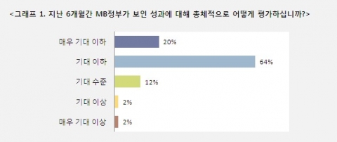 세계경영연구원(IGM, 이사장 전성철)이 지난 8월 한 달간 CEO 118명에게 지난 6개월 간 MB정부의 성과에 대해 물었다. “MB정부의 성과에 대한 CEO들의 생각은?”설문에 참여한 총 118명의 CEO들 중 84%는 지난 6개월간 MB정부가 보인 성과에 대해 ‘기대 이하’라는 반응을 보였다. 이중 ‘매우 기대 이하’라는 응답은 20%였다. 반면 기대수준이거나 그 이상이라는 응답은 16%에 불과했다. (그래프 1)
