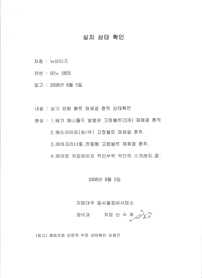 배씨는 현재 정비소 직원으로부터 수리흔적과 관련된 확인서를 받아 GM대우 측에 내용증명을 보낸 상태이지만 지금까지도 별다른 조치는 취해지지 않고 있는 실정이다.