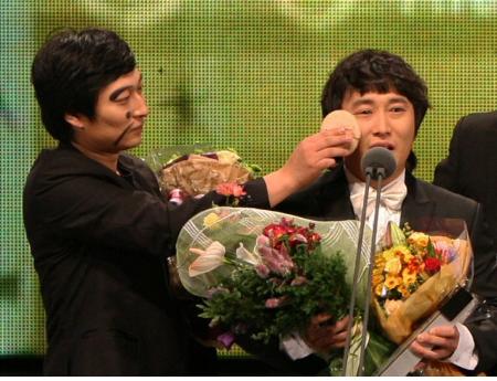 3일 오후 여의도 KBS홀에서 열린 제35회 한국방송대상 시상식에서 코미디언 상은 KBS 2TV '개그콘서트'의 '달인' 김병만이 수상소감을 말하는 동안 노우진(왼쪽)이 땀을 닦아주고 있다.