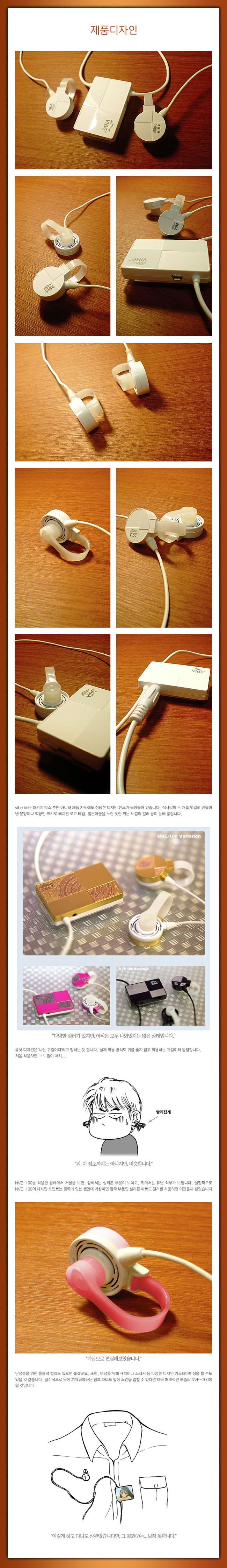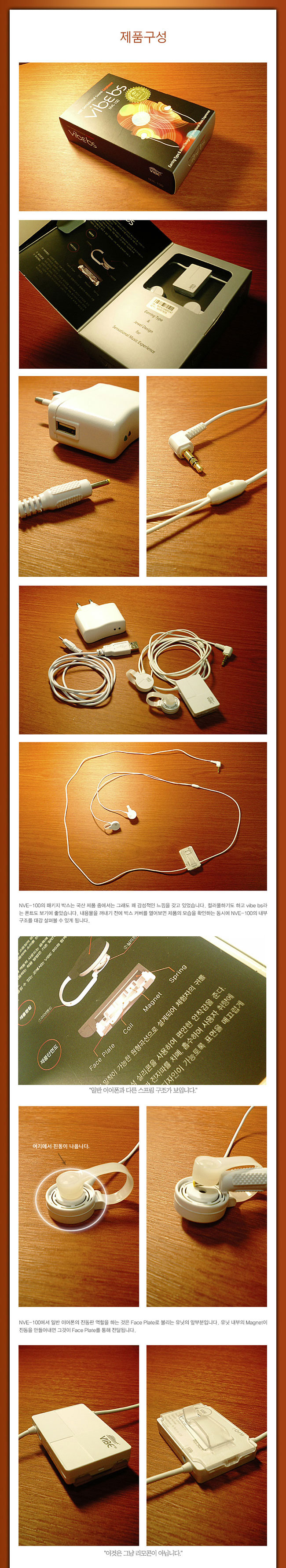 NVE-100은 별도 전원을 사용하며, 재생 시간 6시간 분량의 리튭 폴리머 배터리를 갖고 있습니다. (완전 충전 1시간 30분)이를 충전하기 우해서 별도의 어댑터가 제공되며 그냥 컴퓨터의 USB 단자에 연결해도 충전이 진행됩니다. 전원도 공급하지만 이 네모난 부품은 앰프 역할도 합니다. NVE-100으로 음악을 들으려면 플레이어의 볼륨을 2배 가까이 올려야하는데, 이 앰프가 없었다면...풀 볼륨으로 올려도 모자랄 지경이 아닐까 싶습니다. 어쨌거나~ 이 앰프 파트의 위쪽에는 전원 버튼이 있습니다. 이 버튼을 3초 정도 길게 눌러줘야 NVE-100의 전원이 켜지고 음악을 들을 수 있게 됩니다. 또한, 이 버튼을 짧게 누르면 4단계로 음압을 조절할 수 있습니다. 여기에서 음압이라고 표현한 이유는, 단순히 저항을 통해 볼륨값만을 조절하는 게 아니기 때문입니다. 이 앰프의 초대출력은 0.6W인데 1~4단계에 걸쳐 Gain값을 조절할 수 있습니다. (mW가 아님을 염두에 두시기 바랍니다)보통은 4단계로 사용하게 되며, 나머지 3단계는 장소에 따라 출력을 줄여서 사용할 수 있도록 만들어 졌다고 합니다.(예를 들면 도서관이 되겠지요)