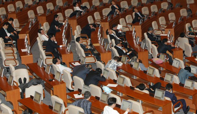 12일 오전 국회 본회의장에서 한나라당 의원들이 정부의 추경예산안 처리를 기다리다가 새벽 4시쯤 아예 잠을 자고 있다.