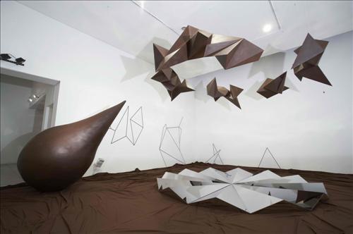 이 설치작품은 높이 5m의 천장에 매달린 다면체의 초콜릿 덩어리 5개와 바닥에 놓인 방울 모양의 초콜릿 덩어리 1개, 이를 거울처럼 비추는 원형의 티타늄 설치물로 구성돼있으며 물방울이 떨어지는 소리가 전시실을 감싼다.(사진=연합뉴스)
