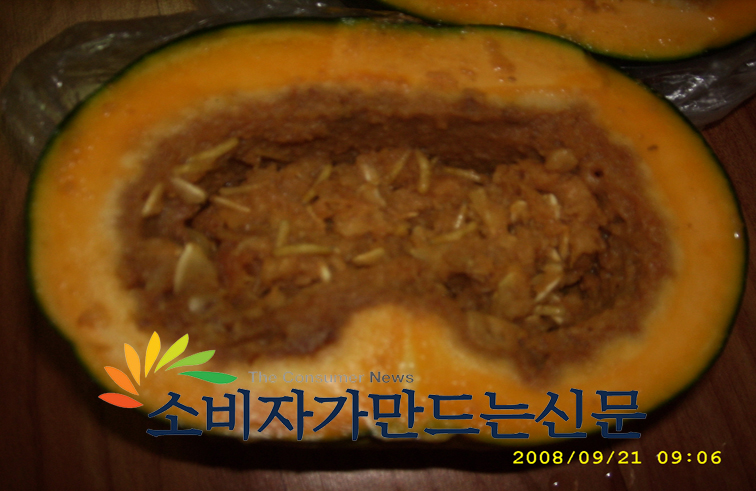 구입한 당일 바로 이유식을 만들기 위해 단호박을 반으로 가른 주씨는 소스라치게 놀랐다. 단호박 속이 온통 애벌레로 꽉 차 있었던 것. 거뭇거뭇하고 썩은 냄새도 났다.