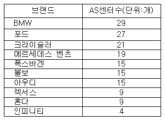 국내에서 4만여대의 차량을 판매한  BMW의 경우 29개(서울 18곳, 지방 11곳)의 AS센터를 운영하고 있고 다음은 포드코리아가 27개, 크라이슬러가 21개, 메르세데스 벤츠가 19곳(서울 6곳, 지방 13곳) 정도로 뒤를 잇고 있다.
