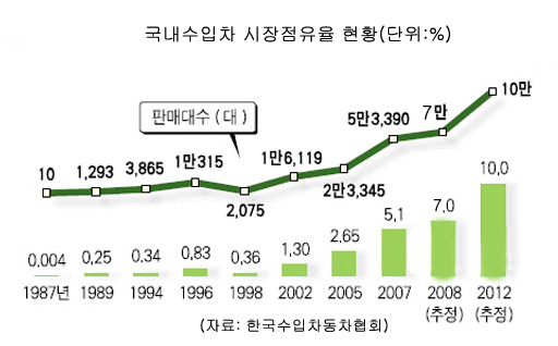 국내에 수입차가 공식적으로 수입된 지 20년. 수입차 원년인 1987년, 10대에 불과했던 수입차의 시장 규모가 최근에는 월 6000대를 넘어서며  국내 자동차 시장의 7% 점유율을 눈 앞에 두고 있다.