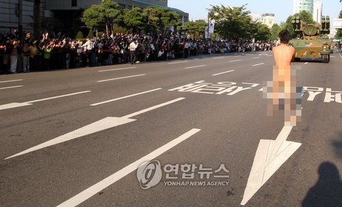 양심적 병역거부와 군대 폐지를 주장하며 화제를 모아 온 강의석(22)씨가 건군 60주년 국군의 날 행진에 뛰어들어 알몸 퍼포먼스를 펼치다가 현행범으로 체포됐다.