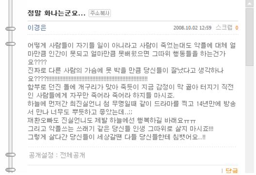 2일 오전 故 최진실이 서울 잠원동에 위치한 자신의 집 욕실에서 목을 매 사망한 채 발견된 이후 수많은 네티즌들이 그의 미니홈피을 방문, 추모물결이 이어지고 있다.