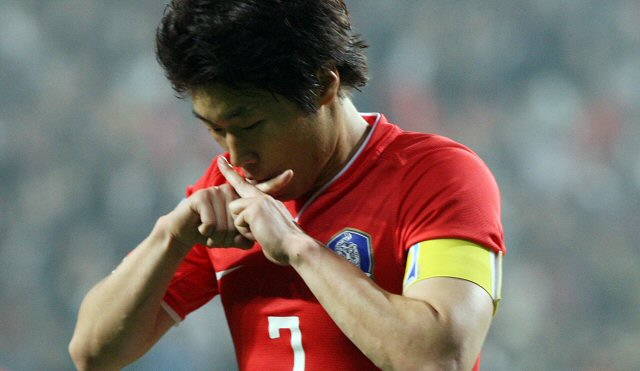 박지성이 15일 서울월드컵경기장에서 열린 2010 남아프리카공화국 월드컵 아시아지역 최종예선 아랍에미리트연합(UAE)과의 B조 2차전 경기에서 두번째 골을 기록한 후 특유의 세리머니를 선보이고 있다.