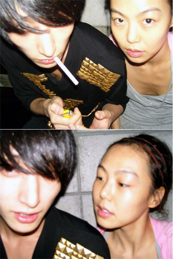 김민희는 화장기 없는 맨얼굴에 회색 운동복을 입고 있고 이수혁은 검은색 티셔츠에 담배를 입에 물고 있다.
