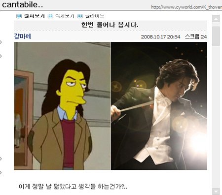 강마에의 미니홈피 제목은 'cantabile..'다. '노래하듯이'라는 뜻의 음악용어를 제목으로 사용한 것으로 눈길을 끌고 있다.