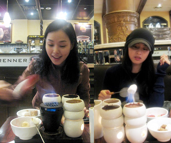 이하늬는 지난 19일 자신의 미니홈피에 김태희와 미국 한 식당에서 퐁듀를 즐기는 모습을 공개했다.