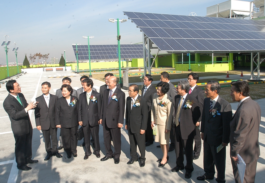 <그린스토어 옥상에 설치된 태양광 설비의 설명을 듣고 있는 이만의 환경부 장관(앞 줄 오른쪽에서부터 여섯번째)과 홈플러스 이승한 사장(오른쪽에서 일곱번째) 등 관계자들>