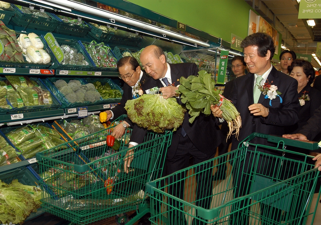 <그린스토어 친환경 식품매장에서 그린카트를 끌며 쇼핑을 시연하고 있는 이만의 환경부 장관(가운데), 홍건표 부천시장(맨왼쪽), 이승한 회장(왼쪽에서 세번째)>