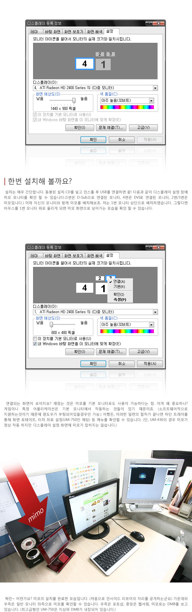 연결할 때는 D-Sub 케이블과 전원을 필요로 했지 만 미모는 필요 없다는 것. 바로