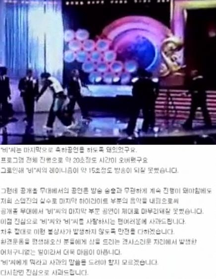 가수 비(본명 정지훈) 생방송 중단 사고에 대해 SBS가 공개 사과했다.