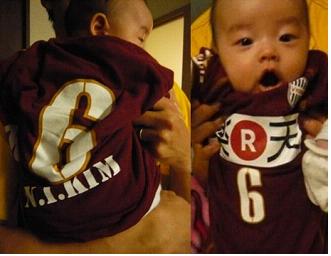 아버지 김남일 선수의 적힌 유니폼을 입은 아들의 사진에는 '드디어 입었다'라는 제목도 붙였다.