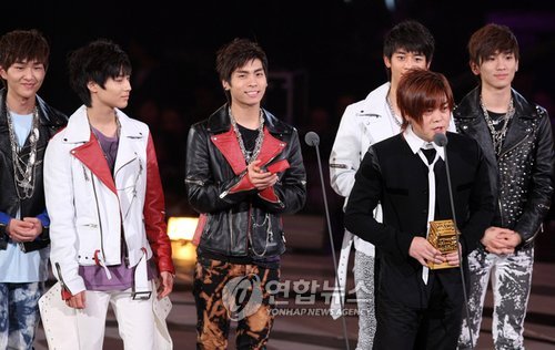 네티즌들은 "13년 선배가 공로상을 받으러 왔는데 참가했던 아이돌 중 제일 선배인 '동방신기'는 일어나 박수 치고 어린 신인들이 앉아서 멀뚱멀뚱 쳐다보고 있다. 최근 아이돌 가수들이 예의가 없다" "새파랗게 어린 후배들이 참 볼썽사납다"는 등 비난을 쏟아냈다.(사진 = 연합뉴스)