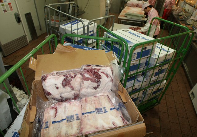 26일 일 오후 서울시내 한 대형마트에서 관계자들이 오는 27일부터 판매에 들어가는 미국산 쇠고기를 손질하고 있다. (위 사진)