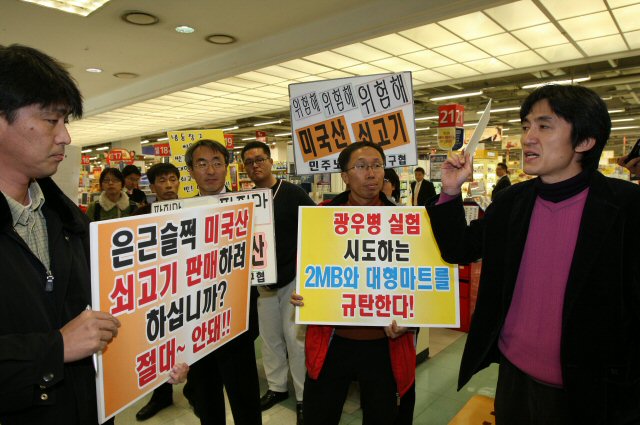 같은 시간 경기도 수원 북수원 홈플러스 앞에서 '광우병위험 미국산쇠고기 수원감시단' 단원들이 27일부터 미국산 쇠고기를 판매한다고 밝힌 홈플러스와 이마트, 롯데마트를 대상으로 불매운동 집회를 열고 있다.(아래 사진)