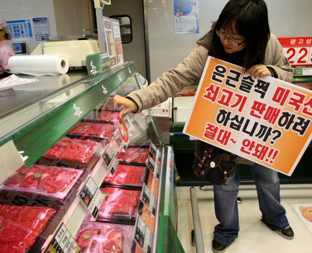 대형마트인 이마트 홈플러스 롯데마트가 미국산 쇠고기를 판매하기 시작한 27일 오후 경기도 수원 롯데마트 천천점 쇠고기 판매대 앞에서 '광우병위험 미국산쇠고기 수원감시단' 한 단원이 미국산 쇠고기의 판매 중지를 요구하는 피켓 시위를 벌이고 있다.