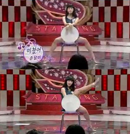 이날 정가은은 손담비의 ‘미쳤어’에 맞춰 섹시한 의자춤을 선보였다. 춤을 추던 중 패널로 출연한 가수 김종국의 무릎위에 앉는 돌발 행동으로 김종국을 당황케 하기도 했다.