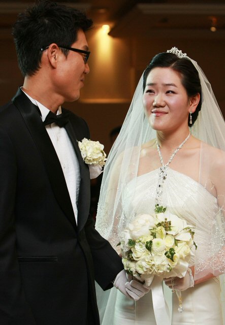 6일 오후 서울 서초구 서초동 노블레스웨딩컨벤션 그랜드볼룸에서 웨딩마치를 울리는 신궁커플 박경모(32.인천 계양 구청)-박성현(25.전북 도청)이 축가를 들으며 감미로운 눈빛을 교환하고 있다.