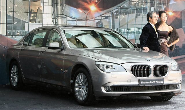 불황의 골이 깊어지면서 국산차 뿐 아니라 외제차 판매도 격감하고 있는 가운데 7일 서울 하얏트 호텔에서 에서 열린 BMW 신차 출시행사에서 김효준 BMW 코리아 사장과 모델이 아시아에서 최초로 선보이는 프리미엄 세단 뉴 7 시리즈를 소개하고 있다.