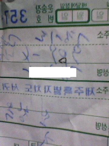 박스에 붙어 있는 주소표기용 종이는 먹지가 파란색이었지만 기사가 검정색 볼펜으로 주소에 들어가는 숫자 0에 동그라미를 하나 더 그려 넣어 8자로 수정해 놓았던 것.