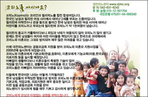 대전외국인노동자종합지원센터(대전외노센터)는 민간 차원에서 우선 1년 동안 미혼모와 코피노 330명을 교육시키기로 하고 이달 초 마닐라 현지에 사무실을 개소했다.