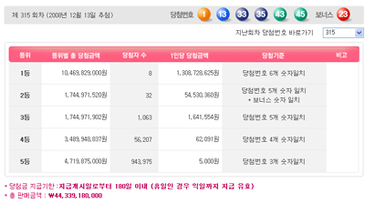 13일 제315회 나눔로또 추첨 결과 1, 13, 33, 35, 43, 45번이 1등 당첨번호가 됐다. 2등 보너스 번호는 23번이다.