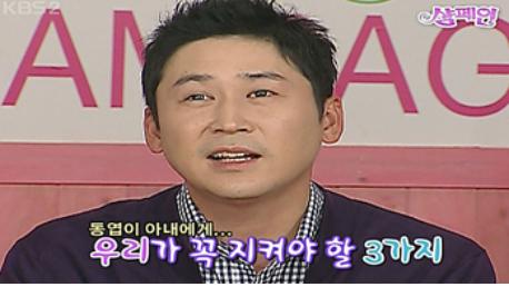 MC 신동엽은 13일 방송된 KBS 2TV ‘신동엽, 신봉선의 샴페인’에서 '최근 심각하게 느껴지는 건망증'에 대해 김숙, 조형기등 게스틀들의 재미난 이야기를 듣던 중 “어느 날 아내가 나에게 ‘당신이 결혼 전에 말한 우리가 지켜야 할 3가지가 정말 인상깊었다’고 말해 깜짝 놀랐다”고 입을 뗐다.