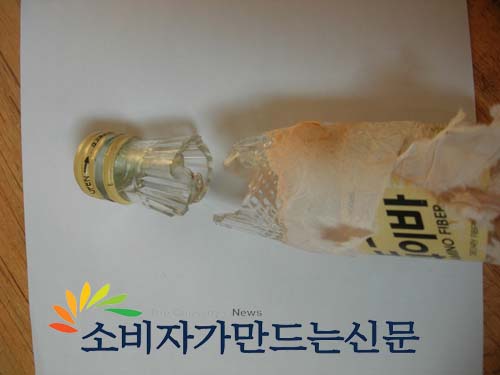 포장 불량인지 힘을 가해도 뚜껑이 열리지 않아 오른손으로 병 부분을 잡고 왼손으로 돌리는 순간 병의 목 부분이 깨지며 오른손 엄지손가락을 스치고 지나갔다.