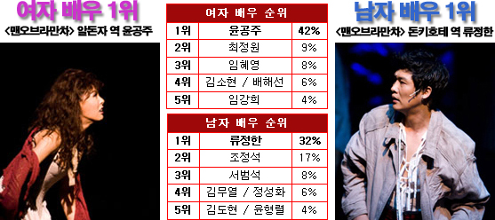 류정한은 올 한 해 동안 뮤지컬 ‘이블데드’, ‘쓰릴 미’, ‘지킬앤하이드’ 등 코미디에서 스릴러까지 다양한 장르의 작품을 모두 성공적으로 소화해내며 관객들의 호평을 받았다. 윤공주는 ‘그리스’, ‘나쁜 녀석들’, ‘미녀는 괴로워’ 등 여러 번의 무대경험을 통해 이미 뮤지컬계의 샛별로 떠오른 배우다. 당당히 남자, 여자 배우 순위에서 1위를 차지한 류정한과 윤공주는 모두 뮤지컬 ‘맨오브라만차’를 통해 관객과 평단의 사랑을 한 몸에 받았다.