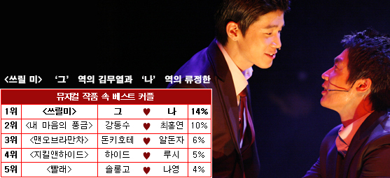 드라마 ‘커피 프린스 1호점’, 영화 ‘앤티크’에 이어 뮤지컬에서 역시 동성 커플의 인기가 뜨겁다. 뮤지컬 작품 속 베스트 커플을 찾기 위한 설문조사 결과 뮤지컬 ‘쓰릴 미’의 ‘나’와 ‘그’가 베스트 커플 1위에 뽑힌 것. 뮤지컬 ‘쓰릴 미’는 니체의 초인론에 심취했던 19세 법대 졸업생 네이슨 레오폴드와 리차드 로브가 14세 소년을 유괴, 살해했던 미국의 실화를 바탕으로 하는 작품이다. ‘쓰릴 미’에서는 이 두 주인공을 ‘나’와 ‘그’라는 인물로 대치시켜 이야기를 풀어가고 있다. 두 남자의 관계를 통해 사랑과 인간 내면의 본질을 꿰뚫는 뮤지컬 ‘쓰릴 미’는 90분 남짓의 공연 시간 동안 단 두 명의 배우와 한 대의 피아노 반주만으로 무대와 객석을 압도 한다.
