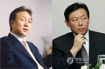 하이트.진로 오너인 박문덕 회장(59.왼쪽사진)은 키와 몸집은 작지만 배짱과 뚝심이 대단한 인물이다.한마디로 말해 '깡다구'로 똘똘 뭉쳐 있는 사람이다.술시장에서만 잔뼈를 키워 온 경영인으로 승부에서 지는 것을 스스로 못 참는 성미를 갖고 있다. 그는 학창시절 싸움실력도 대단했다고 한다.거의 지는 법이 없었다고 한다. 사업에서도 그는 무서운 '싸움 닭'이다. 롯데 신격호 회장(87).신동빈 부회장(54.오른쪽 사진) 부자가 두산 주류사업에 이어 오비.카스맥주를 인수해 본격적인 공격을 해 올 경우 절대 만만하게 밀릴 사람이 아니다. 국내 '술판'이 어떤 방향으로 엎어질 지에 많은 관심이 쏠리는 이유 가운데 하나다.