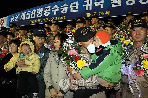쿠웨이트에서 자이툰부대 수송 임무를 맡아온 공군 다이만부대원 27명이 마지막임무를 마치고 C-130 수송기 2대편으로 21일 오후 경남 김해공항에 도착, 가족들과 재회의 기쁨을 나누고 있다.