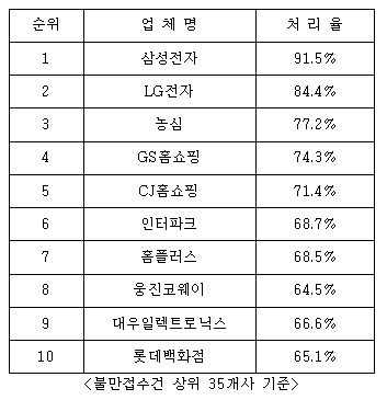 2위는 84.4%의 해결률을 기록한 LG전자가 차지했다. 농심은 77.2%로 3위에 랭크됐다.이어 GS홈쇼핑 (74.29%) CJ홈쇼핑(71.43%) 인터파크(68.7%) 홈플러스(68.5%) 웅진코웨이(64.5%) 대우일렉트로닉스(66.6%) 롯데백화점(65.1%) 등이 ‘베스트 10’에 꼽혔다.