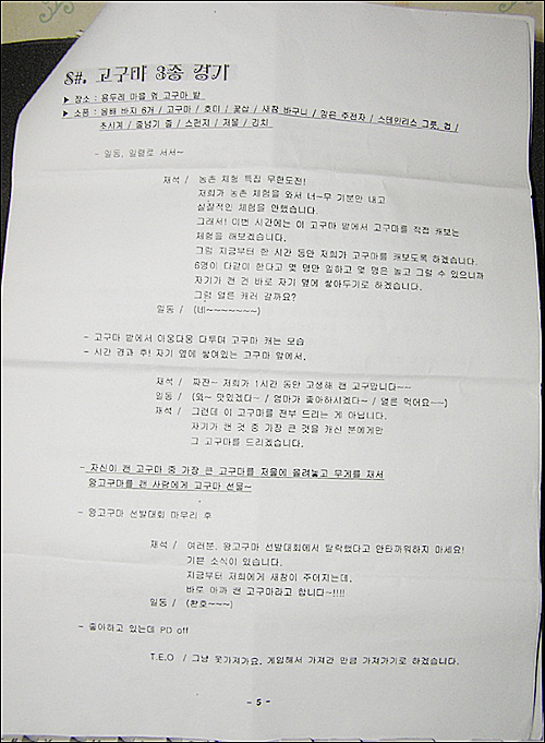 '패떴'에 이어 지난해 2월 17일 방송된 '전남 구례' 편으로 방송된 1박2일 대본이 공개됐고 역시나 대사와 토크 주제, 행동 등이 섬세하게 묘사돼 네티즌들을 실망시켰다.