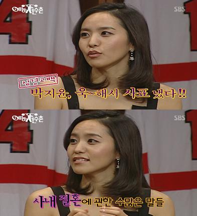 박지윤은 12일 방송된 SBS ‘야심만만 시즌2-예능선수촌’에 출연해 “왜 사표를 냈느냐?”는 MC 강호동의 질문에 “사내 연애를 했는데 같이 다니기만 해도 이러쿤 저러쿵 너무 말이 많아 싫었다. 내 결혼에 사람들이 당사자인 내가 없는 상황에서 말하는 게 불편했다”며 불편한 사내 연애 때문에 사표를 낸 사실을 밝혔다.