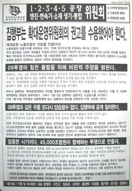 현대자동차 울산 공장 9개 사업부 위원회 위원장(공장별 노조 대표)들은 19일 오후 '집행부는 확대운영위원회의 권고를 수용했어야 한다'는 제목의 공동명의 유인물과 대자보를 붙였다.