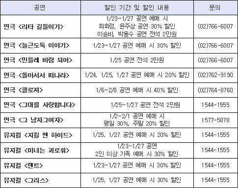 ▶ 리타 길들이기, 30% ↓ ‘연극열전 2’에서 좋은 성적을 거뒀던 ‘앵콜! 리타 길들이기’는 ‘기축년 새해맞이 福(복) 이벤트’를 기획했다. 연극 ‘리타 길들이기’의 원년멤버인 윤주상, 최화정 커플과 새 얼굴 박용수, 이승비 커플의 무대로 꾸며진 이 작품은 1월 23일부터 27일까지의 공연 예매 시 최화정, 윤주상 커플 공연의 경우 30%가 할인되며, 박용수, 이승비 커플의 공연은 전석 2만원에 관람할 수 있다. ▶ 늘근 도둑 이야기, 30% ↓ 코믹 연극 ‘늘근 도둑 이야기’ 역시 1월 23일부터 27일까지의 공연 예매 시 30% 할인된 가격에 티켓을 구입할 수 있다. 연극 ‘늘근 도둑 이야기’는 유쾌한 대사와 배우들의 탄탄한 연기력으로 젊은 관객뿐만 아니라 중, 장년층에게까지 인기 높은 대학로 연극이다. ▶ 민들레 바람 되어, 전석 2만원 역시 ‘연극열전 2’로 기획된 연극 ‘민들레 바람 되어’는 1월 25일 공연에 한해 누구나 전석 2만원에 관람할 수 있다. 연극 ‘민들레 바람 되어’는 평범한 남자 안중기의 일생을 통한 삶과 사랑, 그리고 가족에 관한 이야기를 풀어낸 작품이다. 관객들의 뜨거운 호응에 힘입어 연장 공연이 확정된 ‘민들레 바람 되어’는 2월 13일부터 조재현, 안내상, 정웅인 등 세 배우가 안중기 역으로 분할 예정이다. ▶ 미녀는 괴로워, 30% ↓ 영화 흥행 이후 뮤지컬 역시 사랑받고 있는 ‘미녀는 괴로워’ 또한 1월 23일부터 27일까지 공연에 한해 2인 가족 이상 예매 시 30% 할인을 받을 수 있다. ▶ 그대를 사랑합니다, 전석 2만원 더불어 강풀의 만화를 원작으로 한 연극 ‘그대를 사랑합니다’는 설 연휴 기간 공연을 전석 2만원에 관람할 수 있다. 연극 ‘그대를 사랑합니다’는 황혼의 로맨스를 그린 작품으로 폐지 줍는 송 씨 할머니와 우유 배달원 김만석 할아버지의 러브스토리, 그리고 죽음마저도 함께 하고픈 장군봉 부부의 사랑 그 이상의 사랑을 그리고 있다.