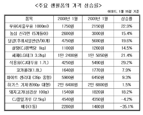 서민들 밥상의 단골메뉴인 양파(39.6%), 고등어(24.5%), 돼지고기(18.2%)등의 가격도 모두 폭등했다. 가격이 내려간 품목은 파, 배추, 무 등 농축수산물 일부에 불과했다.