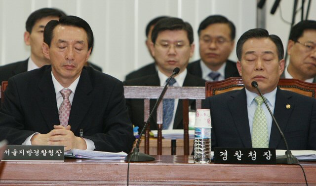 서울 용산 재개발 현장 진압과정에서 발생한 사망사고 원인규명 등을 위해 21일 국회에서 열린 행정안전위원회 전체회의에서 경찰청장 내정자인 김석기 서울지방경찰청장과 어청수 경찰청장이 눈을 감고 있다.