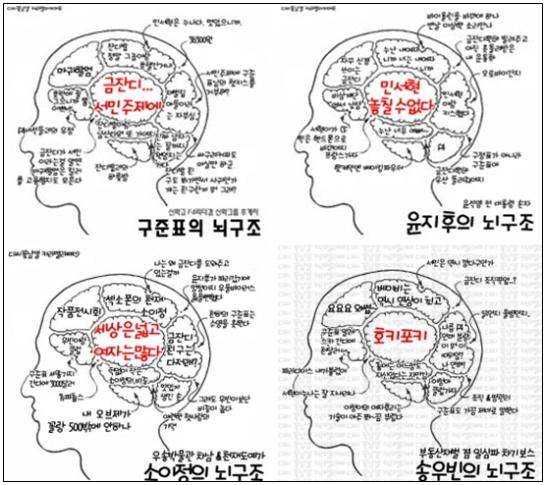 이 그림은 디씨인사이드 꽃보다남자 갤러리에 한 네티즌이 게재한 것으로 구준표, 금잔디, 윤지후, 소이정, 송우빈 등의 뇌구조를 분석한 그림으로 드라마의 인기를 실감케 하고 있다.