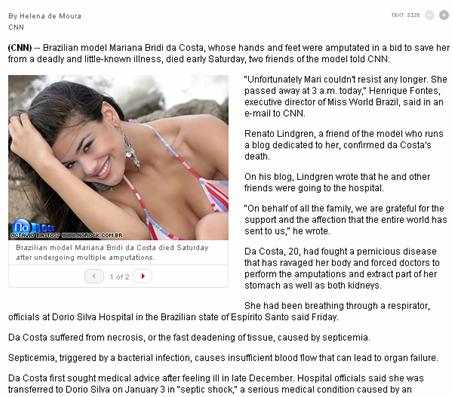 20살 브라질 출신 모델 마리아나 브리디가 급성 패혈증으로 결국 사망했다.