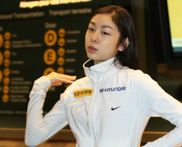 김연아가 2009 국제빙상경기연맹(ISU) 4대륙 피겨스케이팅 선수권대회에 참가하기 위해 2일 오후 캐나다 밴쿠버국제공항에 도착, 취재진의 질문에 답하고 있다. 스폰서인 현대자동차와 국민은행의 로고가 붙은 옷을 착용해 눈길을 끌었다.