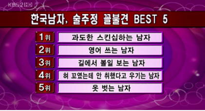 1위는 과도한 스킨십을 하는 남자, 2위는 영어 쓰는 남자, 3위는 길에서 볼 일 보는 남자, 4위는 혀 꼬였는데 안취했다고 우기는 남자 그리고 마지막 5위는 장소 구분 없이 옷벗는 남자가 순위에 올랐다.