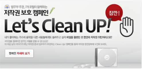 오는 2월11일(수)부터 4월10일(금)까지 2개월간, 7개 포털 홈페이지를 통해 “법무부 주관 7개 포털이 함께하는 저작권 보호 캠페인” 페이지를 오픈하고, 청소년과 저작권보호를 위한 “Let's Clean UP!” 캠페인을 시작한다.